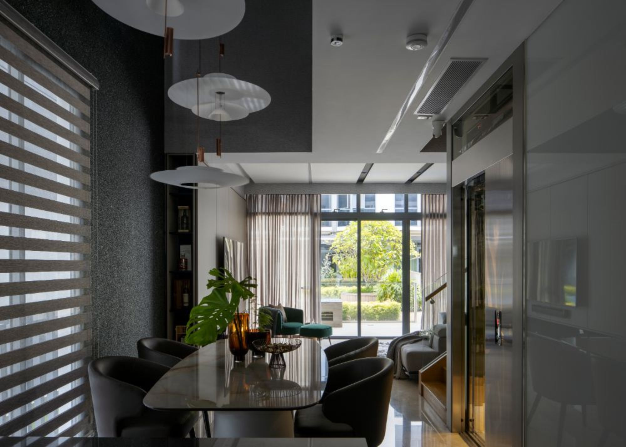 Belgravia Dr is a luxurious modern residence that combines elegance with comfort, featuring a sophisticated palette of neutral tones accented by gold, teal, and natural wood. The interiors are bathed in natural light, complemented by carefully placed artificial lighting, creating a warm and inviting atmosphere. Bedrooms showcase statement headboards with paneling and vertical gold or LED accents, plush rugs, and large windows draped with sheer and blackout curtains, striking a balance between light and privacy.